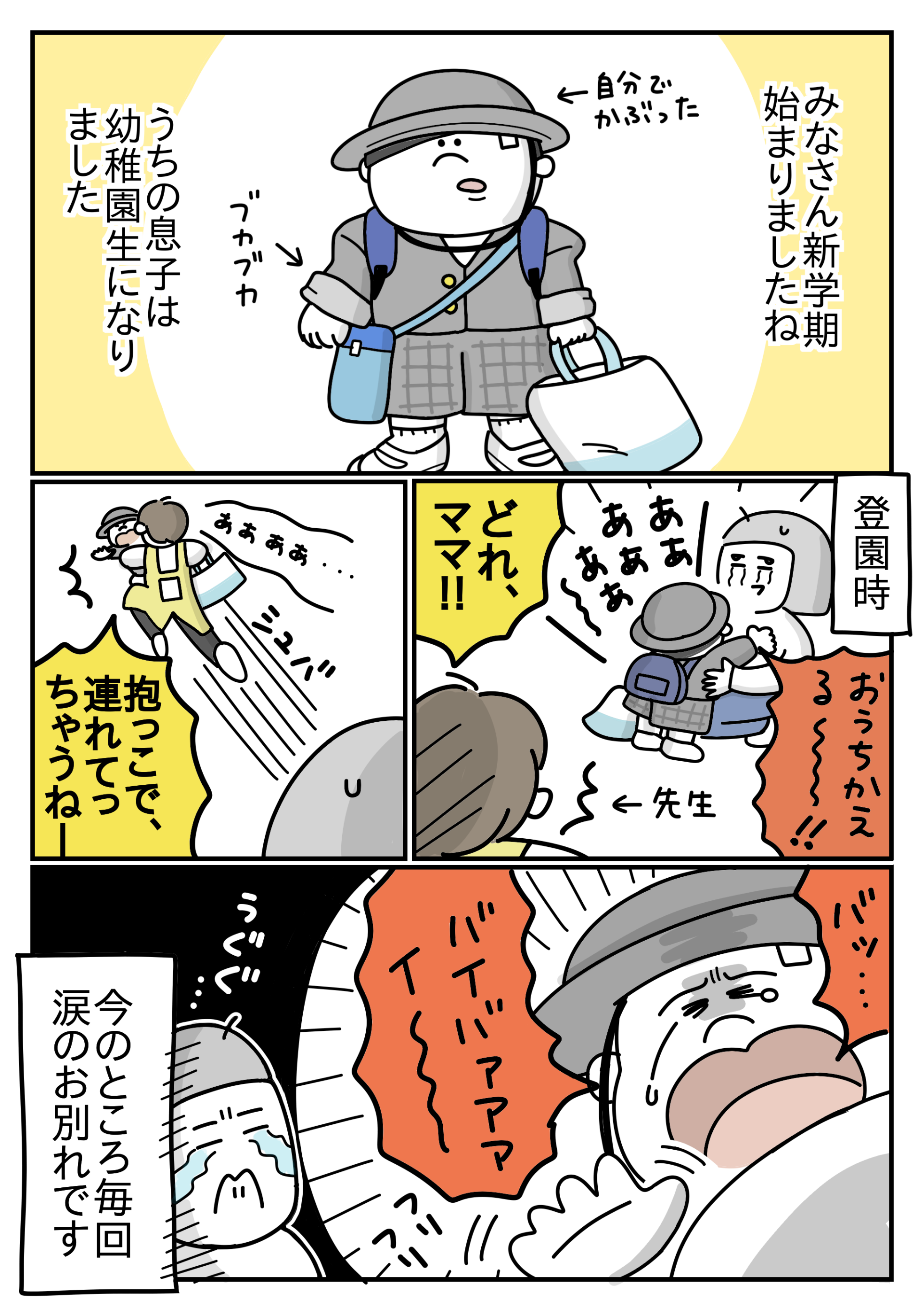 2024年04月15日 新学期のようす 毎回ハラハラドキドキの登園ですが、さすが先生たちは手慣れてますね。いつも息子がグズると、あっという間に回収して行ってくれます(笑)助かるなぁ〜、、☆コドモエwebにて連載中です↓ 登録よろしくお願いしますX(旧ツイッター)はこっちインスタはこっち < 前の記事次の記事 >