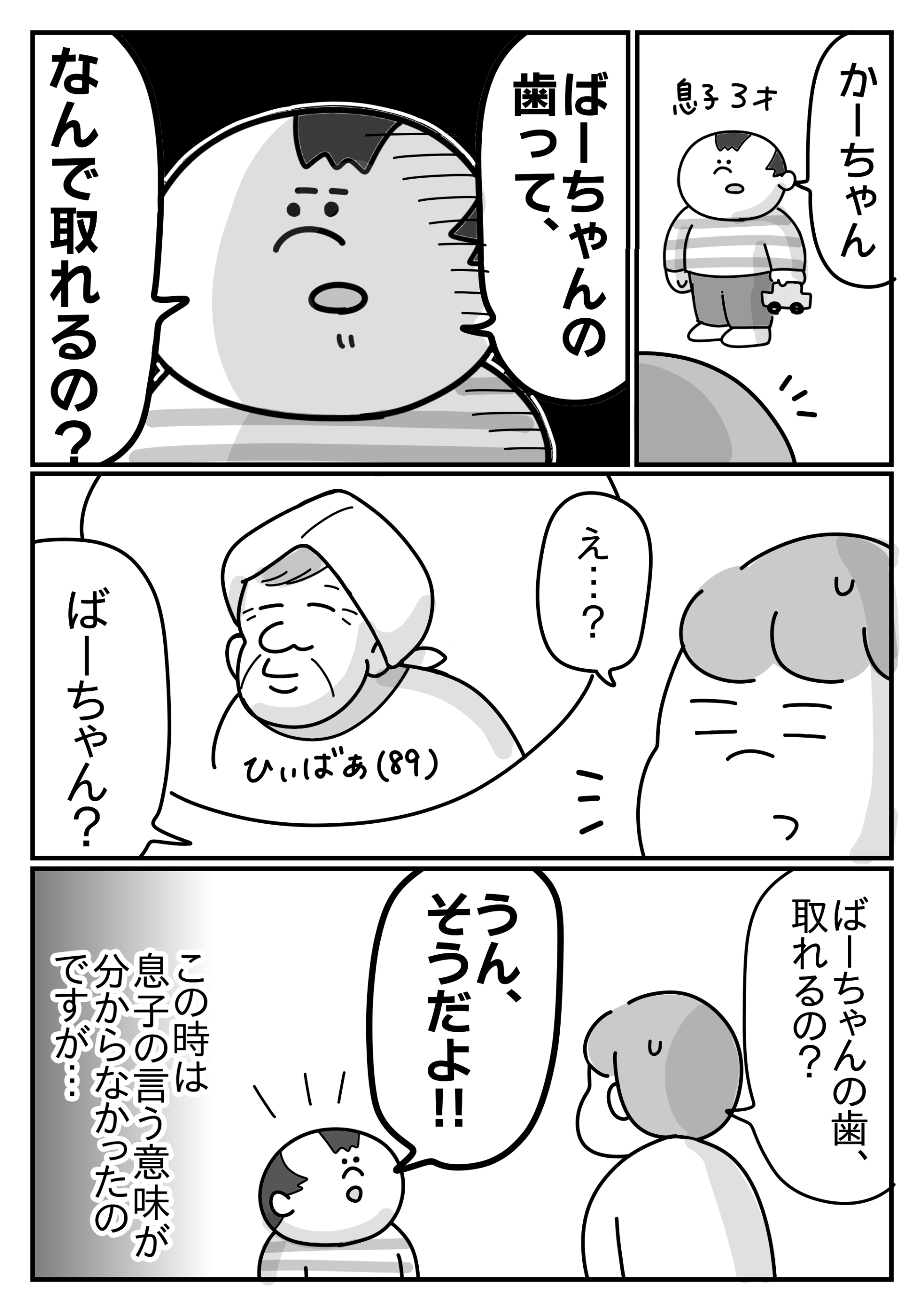 2024年10月11日 「ばーちゃんの歯って、なんで取れるの?」の真相 時々こうして、ひ孫の反応を楽しんでいたようだ…☆コドモエwebにて連載中です↓ 登録よろしくお願いしますX(旧ツイッター)はこっちインスタはこっち < 前の記事次の記事 >